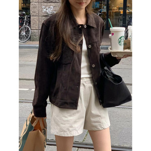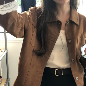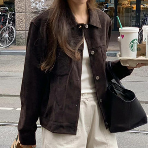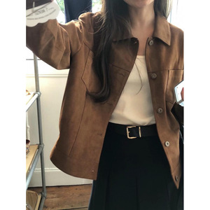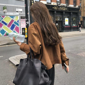 フレンチレトロダメージ加工シンプル通勤万能ラペルダブルポケットデザインルーズワークジャケット