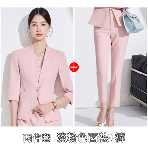 小香風ピンクの襟なしの小さいスーツのコートの女性のワンピースのスーツの春の夏の7分の袖のカジュアルなスーツの上着