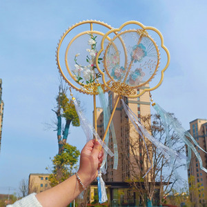 メーカー直販刺繍古風団扇長柄リボン異形円形扇中扇漢服写真刺繍扇子
