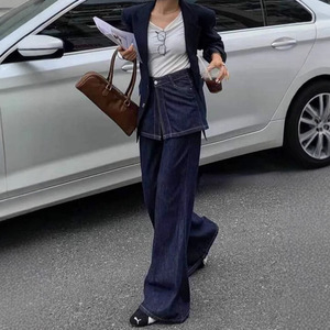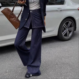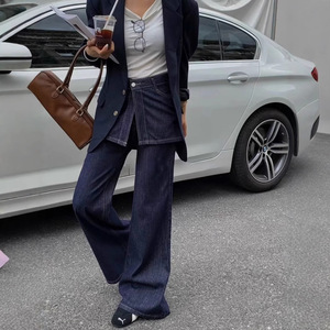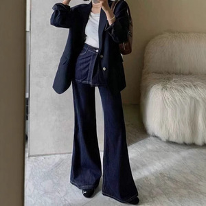 偽の2つの紺色の微ラッパジーパンの女性2025春秋の新型の高腰はやせているデザイン感があります。