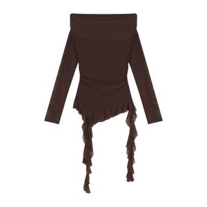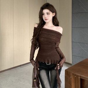 一字の肩の網の紗の長袖の日焼け止めのtシャツの女性の秋の修身のリボンの不規則な甘いギャルのガードルの短い上着