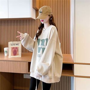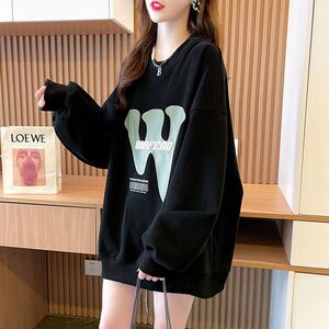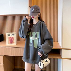 カジュアルな丸首のパーカーの女性はだらだらしています。