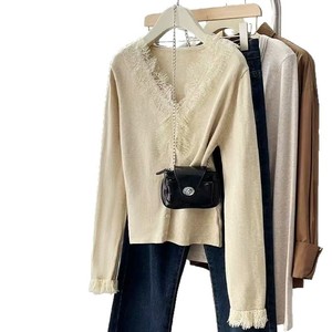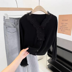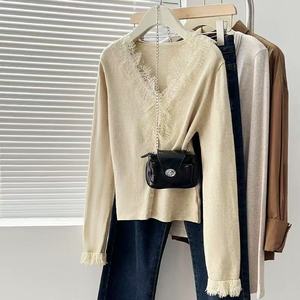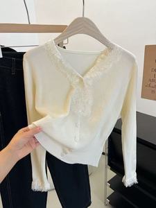 レースvネックの底のシャツの女性2025春の新型のフランスのデザイン感の中にセーターの短いニットの上着を掛けます。
