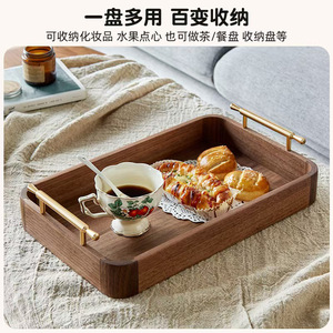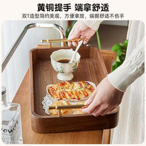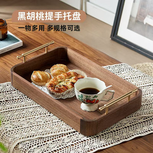 黒クルミ材収納木製トレイ、シンプルなティーカップトレイ、木製長方形パン皿、持ち手付き、ポータブル
