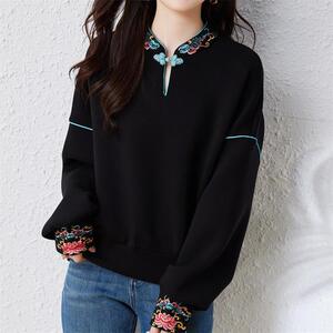 実写スポット秋の新型立襟国風衛衣女性デザイン感が独特な黒長袖カジュアル上着