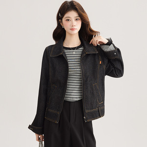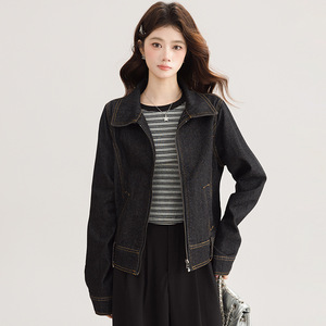 実拍2025年と秋の新型アメリカのレトロな黒いデニムのショートコートの女性の襟をひっくり返します。