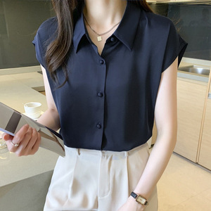 シャツの女性のデザイン感の小さい大衆2025夏の新型の気質はやせているシフォンの半袖の上着の職業のシャツの薄い金を現します。