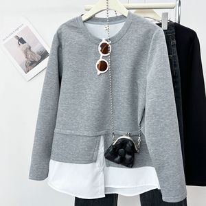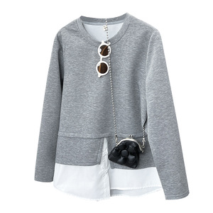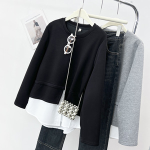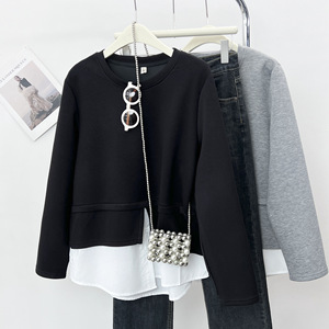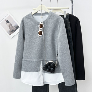2025春の200斤の太った妹の新しいカジュアルなつなぎ合わせ偽の2つのガーディアンの女性の丸首の上着6142
