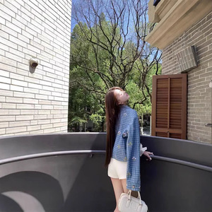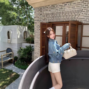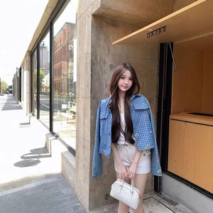 CHICYOUブルーの格子の小さい花の刺繍2025早秋の新型の百合はやせている日常のカジュアルなデニムのコートを現します。