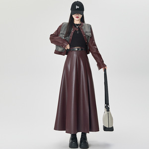 カレー色の皮のスカートの半身のスカートの女性の秋冬の2025新型の長い腰はやせている感じが現れます。