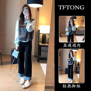 単品/秋装新配合塩系軽熟韓系小香風馬甲シャツ高腰ジーンズ女装ブーム