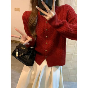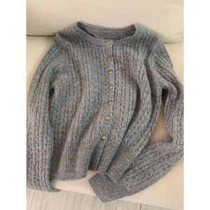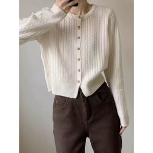 鄂家100% 純ウール絞り丸首女性麻花ファッションカジュアル気質ニットカーディガンセーター秋冬