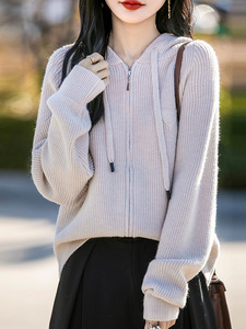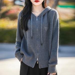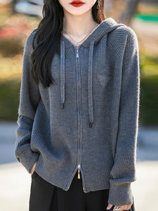 【メーカー直送】帽子付きの純色のダブルファスナーのカーディガンのコートがゆったりしています。