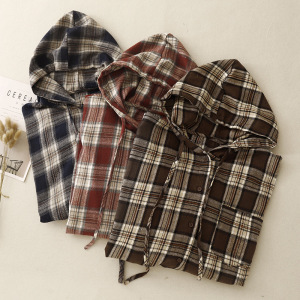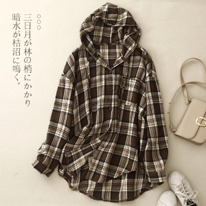 綿麻の格子の帽子のシャツのコートの女性の春と秋のゆったりしていて、だらだらしています。