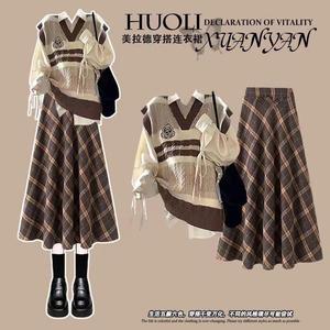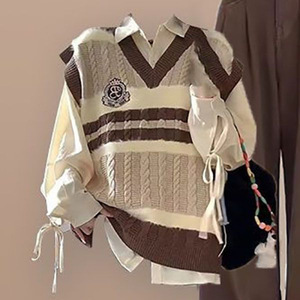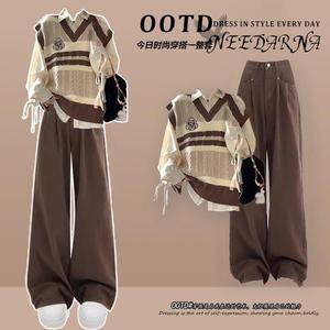 秋のスーツ女子学生韓国版ゆるい長袖シャツニットストライプ馬甲高腰ジーンズ3点セット