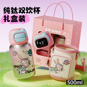 新型内外純チタン子供保温カップ高颜値小学生専用ストローカップ携帯カップギフトボックス