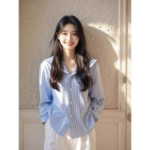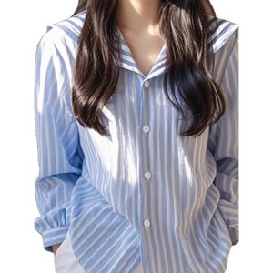 フランスの青いストライプの海軍の襟のハイエンドの長袖のシャツのドーパミンの高級感の気質の小さい上着の婦人服の早秋