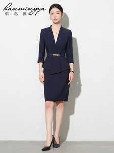 職業スーツの女性と春秋の小さい子供の大学生の面接は正装の気質を身につけてスーツの上着の作業服を修理します。