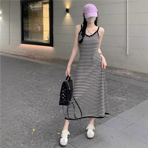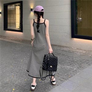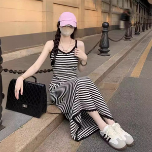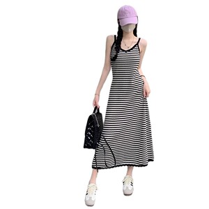 夏のストライプのストラップニットワンピースの女性の長いタイプの膝のvネックはやせています。
