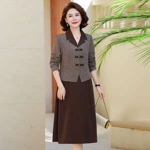 中高年女装春装長袖偽二枚ワンピースファッション2025新作母装春秋洋気スカート