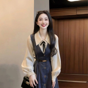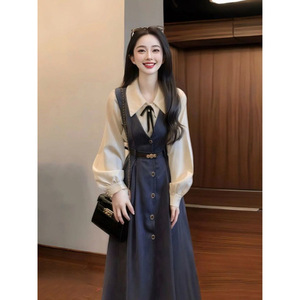 【ポリエステル素材の快適な肌】フランス学院は腰の文芸の復古的な新型のワンピースの長袖を収めて襟をひっくり返します。