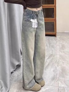 レトロな毛の縁のまっすぐな筒のジーパンの女性の春秋の新型のナシの形の体つきの大きいサイズの高腰はやせています。