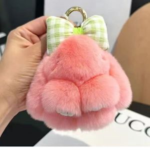 超可愛い本物のウサギ毛のリボン付き小さなウサギの車のキーホルダー、インスタ映えする素敵なバッグ飾り