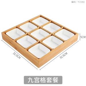 竹色の9コンパートメント竹箱+9つの白いディナープレート