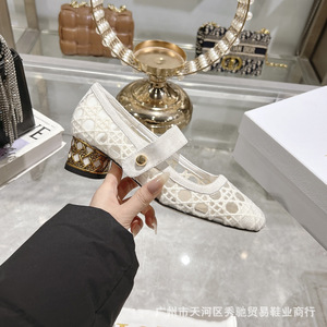 ハイバージョン 2025D 新しいジャカード刺繍シリンダーヒールバレエシューズスクエアトゥローヒールメリージェーンレースシューズ