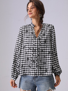 【IRISERLY】フレンチスタイルの個性的なデザイン、黒の花柄チェック柄シャツ、レディース長袖タイアップシャツ