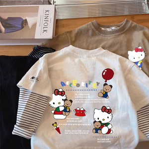 女の子の長袖tシャツ春秋の子供の漫画のケイティの洋風の丸首の底のシャツの偽の2つの上着のt