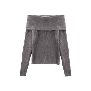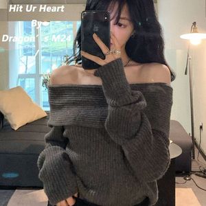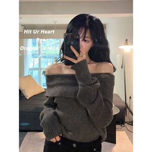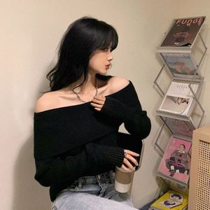 純粋な欲の怠惰な風の1字の肩のセーターの女性の秋冬の短いタイプの肩の高級感の黒色の1字の襟のニットの上着
