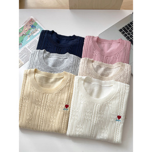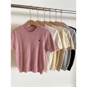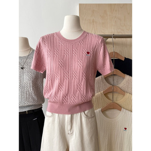 春季韩系麻花针织爱心印花正肩短袖T恤衫圆领显瘦修身百搭上衣女