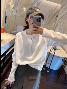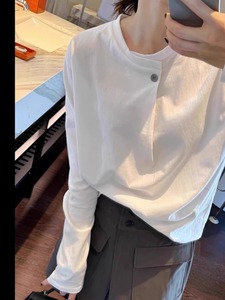 純綿の肩の白い長袖のtシャツの女性は2025春と秋にゆったりしています。