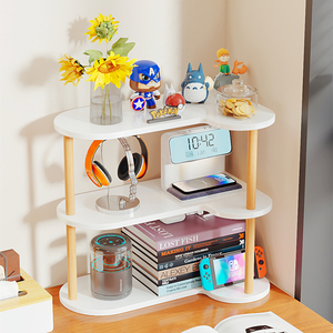 M & 本のデスクトップの角の本棚の収納物の多層棚のテーブルの上で整理します。