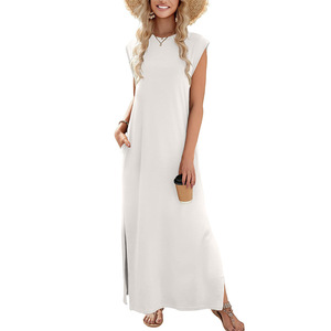 2025 アマゾンクロスボーダーレディースノースリーブラウンドネックドレスサイドスリットとカラフルなロングスカート多用途でファッショナブル