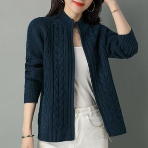 半高襟ジッパーニットカーディガン女性2025年春秋新純色肩袖ねじ上着百合セーター