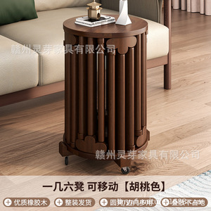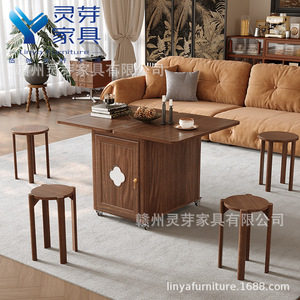 ウォールナット色の一体型コーヒーテーブル + フォーインワンスツール