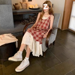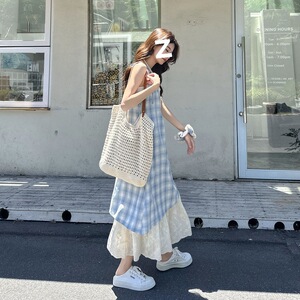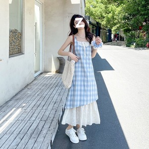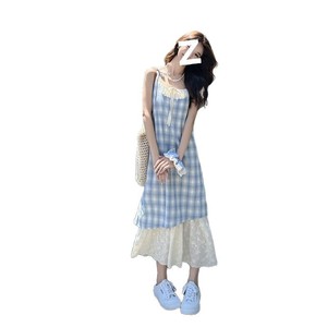 青い格子縞の大衆デザインのサスペンダーのスカートのワンピース2025の新型の夏の女性の偽の2つはレースの長いスカートをつなぎ合わせます。