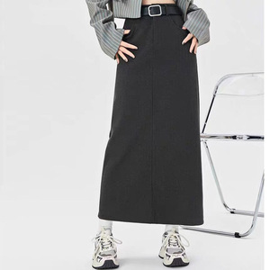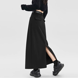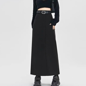 黒いスーツの半身のスカートの女性2025春秋のまっすぐな筒は尻の1歩のスカートの後でフォークのA字の中で長いスカートを包みます。