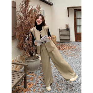 カーキ色の小香風馬甲セット女性秋2025新型韓国系気質高級感ワイドパンツ2点セット