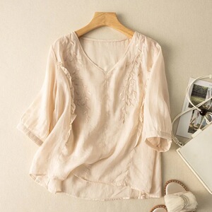 2025夏の新型刺繍綿麻上着のゆったりした気質文芸復古七分袖中国風カジュアル百合