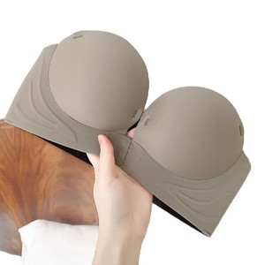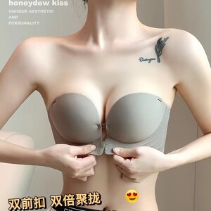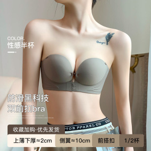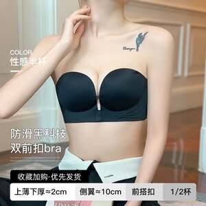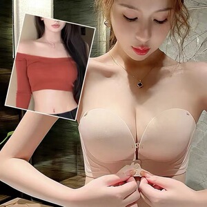 前ボタンの肩ひものない下着の女性の滑り止めは小さい胸に集まって大きく見えます。