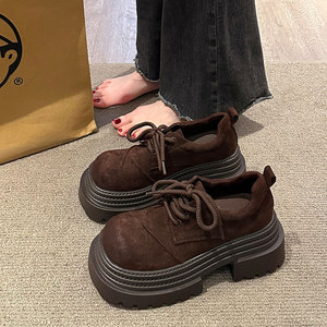 欧品の砂の皮の大きい頭のひもの靴の女性の2025年の春秋の新型の厚い底の百合の松の餅の高くなる楽福の靴