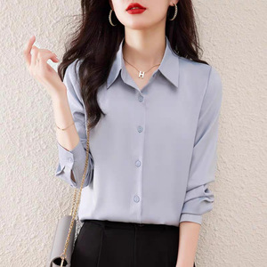 高級感のあるサテンの白いシャツの女性の長袖の春の通勤シャツの職業の気質の面接の中で底の上着を掛けます。