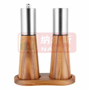 アカシアの手動ステンレスの胡椒と黒胡椒のサンショウの海塩の研磨器のベース付きの調味料の瓶のセット