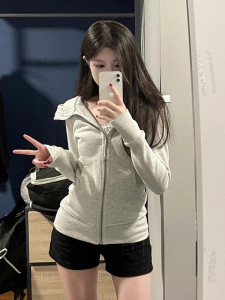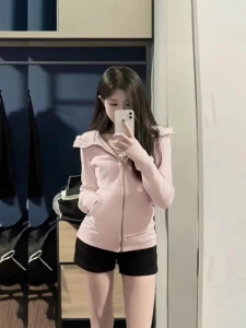 自宅工場現物華綿牛乳リボン指ボタン帽子付きスリムウエストジッパーコートカーディガン