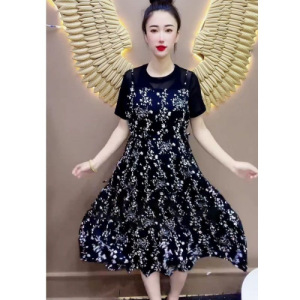 プラスサイズファットmm 100kg 夏 2025 新しいファッショナブルな年齢を減らすラウンドネック花柄ミドル丈スカートウエストドレス女性用