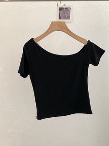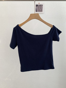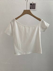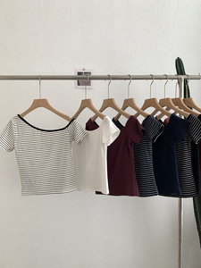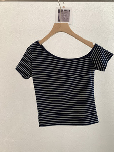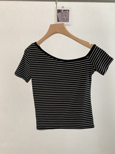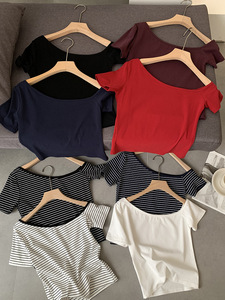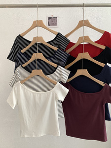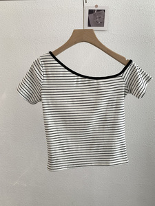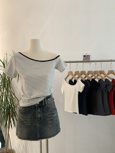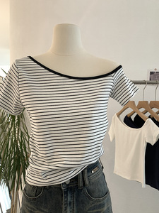 欧玛莱 条纹斜肩短袖T恤女夏季新款辣妹修身显瘦短款上衣实拍2566