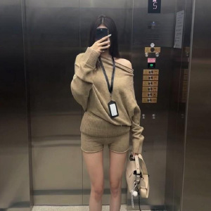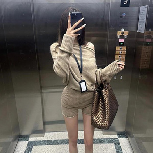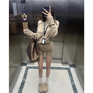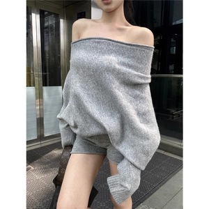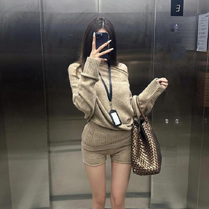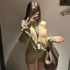 7針の北極の絨毛 ~ 斜めの肩の長袖のスーツの女性の2025新型のゆったりしている怠惰な感じのニットの半ズボンの上着